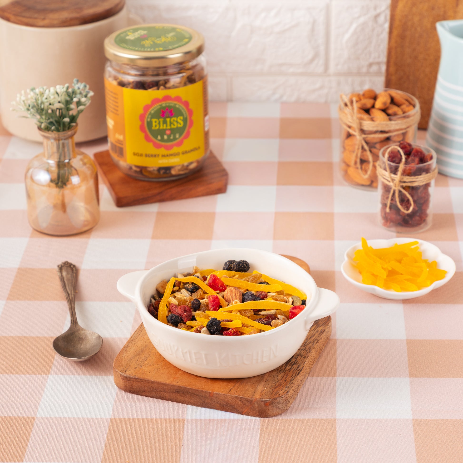 Start your day with a tropical twist, courtesy of our mango berry granola. Sweet and chewy dates, tangy goji berries, and crunchy nuts come together in perfect harmony. This wholesome granola is carefully crafted without oil or ghee, making it a guilt-free delight. With a hint of natural sweetness every bite is a flavor sensation. Enjoy as a healthy breakfast, snack, or anytime treat that's as delicious as it is nutritious.
